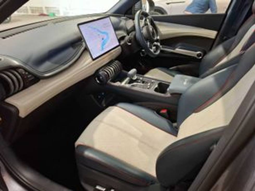 - Vegan leather seats with red piping